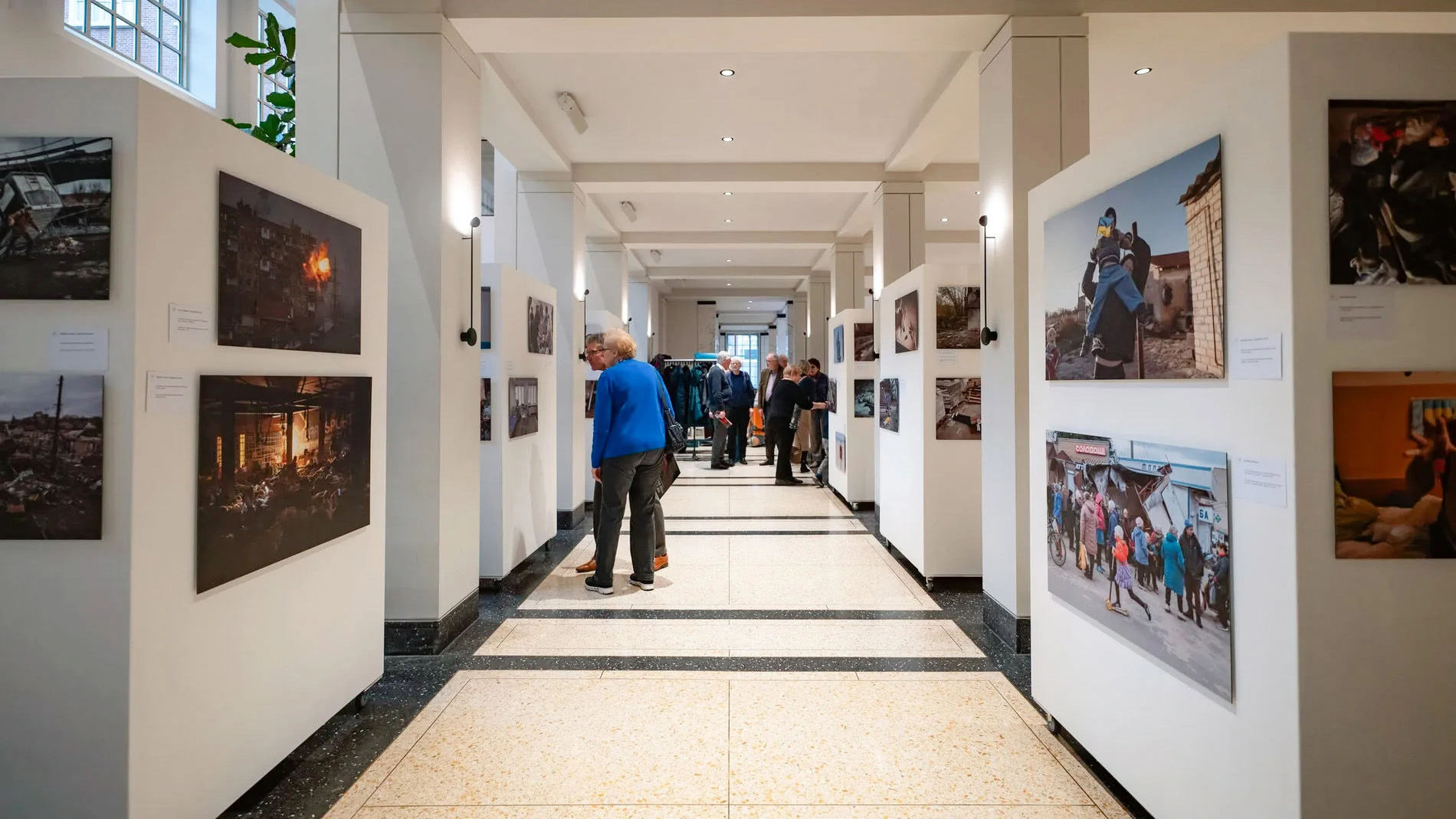 The exhibition includes visual stories from Bucha, Kharkiv, Bakhmut and Mykolaiv. Some images document missile strikes; others reveal small moments of care — volunteers helping the elderly, or children sketching drawings in bomb shelters.