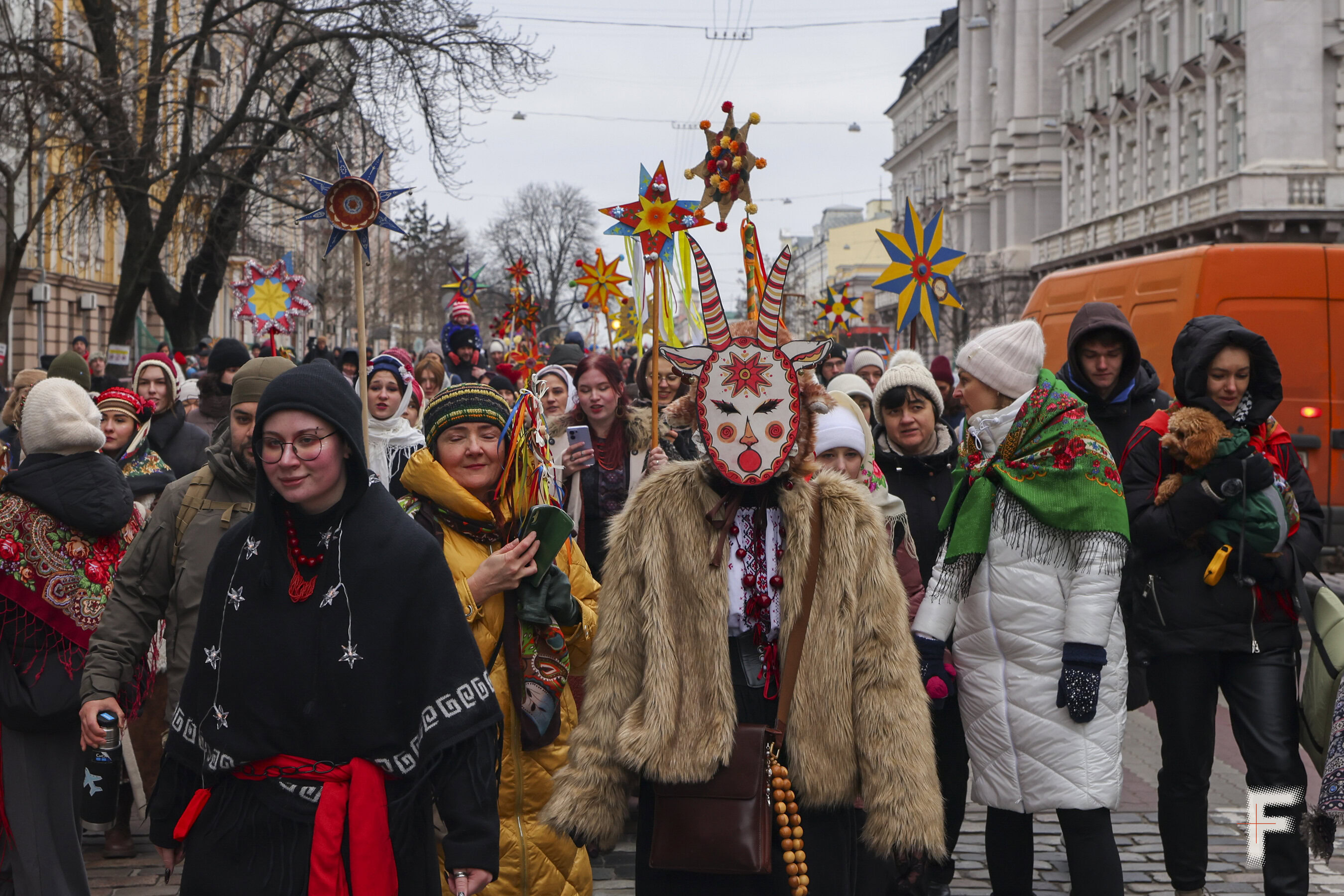 На Різдво кияни провели традиційне різдвяне дійство – вертеп та колядування. Обхід колядників розпочався із Михайлівської площі, звідки ті рушили на Золоті ворота та завершили на Майдані Незалежності. Frontliner публікує фотографії зі святкування Різдва у Києві.